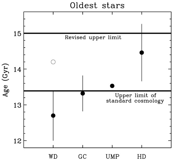Finally, “WD” denotes white dwarfs (WDs) for which the age is determined from white dwarf cooling. The observed luminosity function of white dwarfs in the globular cluster M4 was fitted with theoretical models to give an age of () Gyr [26]. The same model parameters were used for white dwarfs in the Galactic disk, giving () Gyr. This is 1.5 Gyr lower than the mentioned 8.8 Gyr value determined from nucleocosmochronology [22]. While the absolute age scale of the white dwarf cooling method is sensitive to the model parameters, the relative age difference of () Gyr Gyr between the halo and the disk is not. If one raises the disk age from 7.3 Gyr to 8.8 Gyr to make it consistent with nucleocosmochronology while retaining consistency of the WD cooling method, then the halo age needs to be raised from 12.7 Gyr to 14.2 Gyr; this value is plotted as an open circle in Figure 2; the value plotted lies well beyond the upper age limit of standard cosmology.
