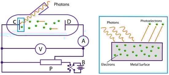 Left: schema of the setup for studying the photoelectric effect: C—photocathode; D—anode; V—voltmeter; A—ammeter; P—potentiometer; B—power supply. Right: explanation of the effect (the box in blue).