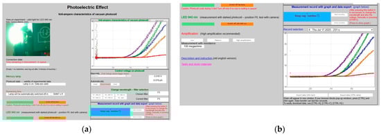 (a) Graphical interface of the experiment for determining the I–V characteristics of a vacuum photocell [31]. (b) Measurement-saving window with the data curves displayed [31].