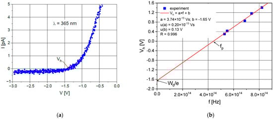 The measurement results are saved in Excel format and displayed on the interface screen. Users can then copy the data to a local computer for further processing (Figure 2b). A description of the method for using the measurement interface is available on the experiment website [31]. A mercury lamp and a set of filters enabling the selection of wavelengths are used to illuminate the photocell, which enables the I–V characteristics of the photocell for a given light frequency to be determined. This experiment uses a PHYWE Systeme GmbH und Co. KG (Göttingen, Germany) photocell with an Sb–Cs (antimony–cesium) cathode that has a spectral response from UV to visible light [37]. An example of an I–V characteristic is shown in Figure 3a. The Vh is determined from the I–V characteristic by finding the maximum voltage for the zero photocurrent for a given wavelength. The measurement results are presented in Table 1.