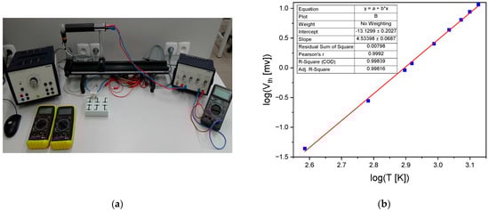 (a) The Stefan–Boltzmann experimental setup [41]. (b) Dependence (15) of the thermopile voltage on the bulb filament temperature in a double-logarithmic scale—testing the Stefan–Boltzmann law. See text for details.