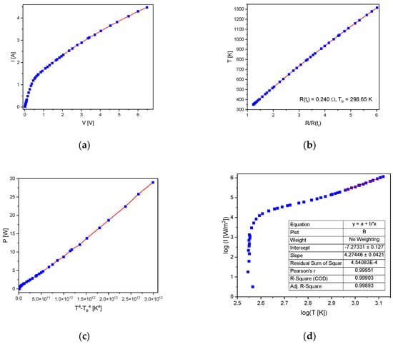 Finally, Figure 5d shows the dependence of the power per square meter (Equation (16)) on the absolute temperature in double-logarithmic coordinates. The surface, S, of the bulb filament can be calculated from the measurement of the radius, r, of the filament wire [16] or its mass, m, and resistance, R(tr), as follows: