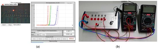Many school and university laboratories use the study of the I–V characteristics of LEDs to determine the Planck constant [20,22,23,24,45,46,47]. Here, to determine the Planck constant based on the I–V characteristics of LEDs, the remote experiment [31] is used. The measurement methodology and the obtained results are described below and compared with the experiment conducted in the student physics laboratory at SUAS. The graphic interface of the experiment, available via the website [31], is shown in Figure 6a along with an example of I–V characteristics. The measurement results are automatically saved in an Excel file, which can be copied to a local computer and then processed. Figure 6b shows a device for determining the Planck constant from the study of I–V characteristics of LEDs used in the SUAS physics laboratory.
