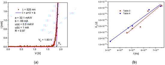 (a) Example of developing an I–V characteristic to determine the threshold voltage Vp. u(a) and u(b) represent measurement uncertainties, where a and b are the linear function coefficients and R is the linear correlation coefficient; (b) Dependence of the energy Ea (19) on the frequency of the light wave for two different datasets presented in Table 3 and Table 4.