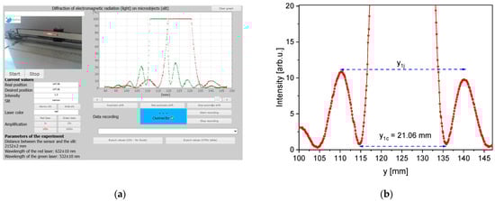 Measurements can be carried out remotely using the equipment as described on the website [31]. The measurement consists of a narrow or wide slit and laser light with a wavelength of 632 ± 10 nm (red laser) and 532 ± 10 nm (green laser). The intensity of the light in the diffraction pattern is analyzed using a photocell, and the results are saved in an Excel file on a local computer. The examples of measurements are shown in Figure 8a.