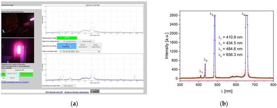 The remote experiment [31] allows one to obtain the hydrogen and mercury atom spectra at a visible band. The location of the spectral lines can also be easily determined by having a grating spectrometer and a spectral lamp containing hydrogen gas in a diluted form in the laboratory. Based on the spectrum of the Balmer series, individual wavelengths for this spectral series are determined in the visible band [55]. By following the description of the remote experiment [31], a hydrogen atom spectrum is obtained (Figure 9a). The length of individual spectral lines in the Balmer series describes the following relationship: