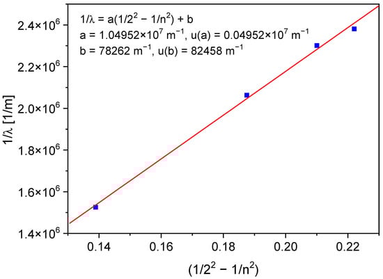 There are four spectral lines in the visible band (Figure 9b): red corresponding to the 3→2 transition, blue-green corresponding to the 4→2 transition, blue-violet corresponding to the 5→2 transition, and violet corresponding to the 6→2 transition. Figure 10 shows the dependence of 1/λ on (1/22–1/n2), where n = 3, 4, 5. The wavelengths of the spectral lines were read from Figure 9b. From the least-squares fitting of a straight line to the points shown in Figure 10, the Rydberg constant equal to RH* = (1.0495 ± 0.0429) × 107 1/m was determined. This value is consistent with the recognized one because the compliance condition is met, namely, 0.047 < 0.086. For example, more precise values of the Rydberg constant were obtained using a grating spectrometer coupled to a digital camera [56] or the optical and computer-aided diffraction-grating spectrometer [57]. Then, the Planck constant can be determined as