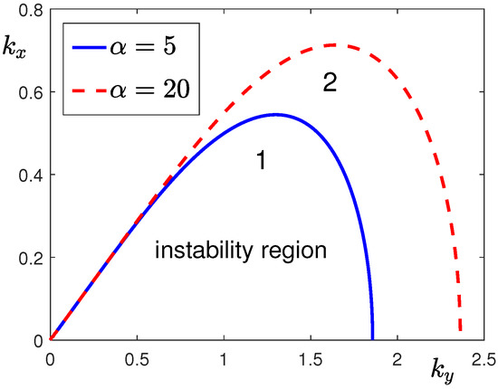 A necessary but insufficient condition for instability corresponds to . The curves on the plane for and are shown in Figure 1. The behavior of the function Q from the wave numbers of the drift-gravity wave and does not change qualitatively in a sufficiently large range of variation of the parameter . If and , one obtains a simplified expression . Interestingly, in this limit the condition coincides with the necessary condition for instability of the zonal Rossby flow [13]. Taking into account Equation (22), one has from Equation (18)