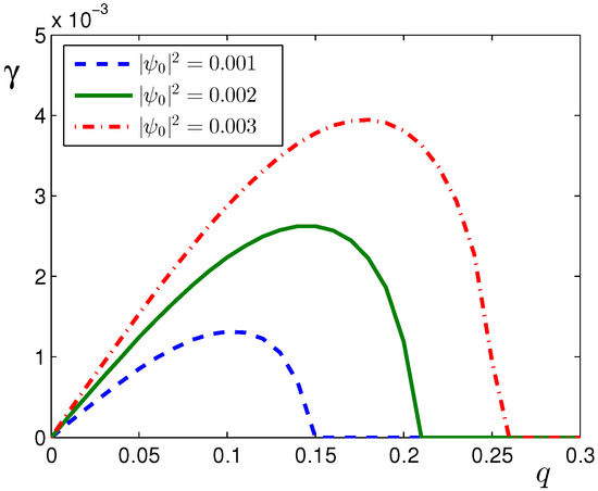 where we take into account that since . The dependence of the instability growth rate on the wave number of perturbations q in the case for different values and for specific values and is shown in Figure 2. The optimal wave number corresponding to the maximum growth rate is found from Equation (25):