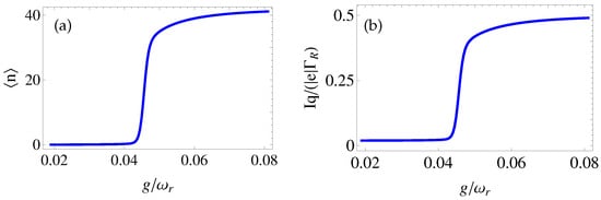 Figure 1a shows the steady-state dependence of the mean cavity photon number as a function of the DQD-resonator coupling strength, near two-photon resonance, i.e., , extracted from the system of Equation (11). Particularly, the decay rates were selected within the secular approximation, that is, they were smaller than qubit frequency , in concordance with the valability of the master Equation (9). As a result, one observes a threshold transition when the mean photon number abruptly changes from lower to higher values, or, conversely, when varying to some degree the qubit–resonator coupling strength. Actually, this behaviour is typical for an externally coherently pumped and leaking cavity mode, containing a Kerr-like non-linearity [32,33], for instance. Here, however, this behaviour is due to the unilateral electronic pumping of the DQD sample, i.e., from the left to the right.