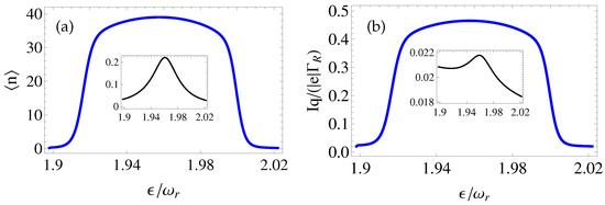 The steady-state behaviours of (a) the mean cavity photon number and (b) the current through the DQD system, as a function of . Here, and , while in the insets, , i.e., below the threshold. Other parameters as in Figure 1.