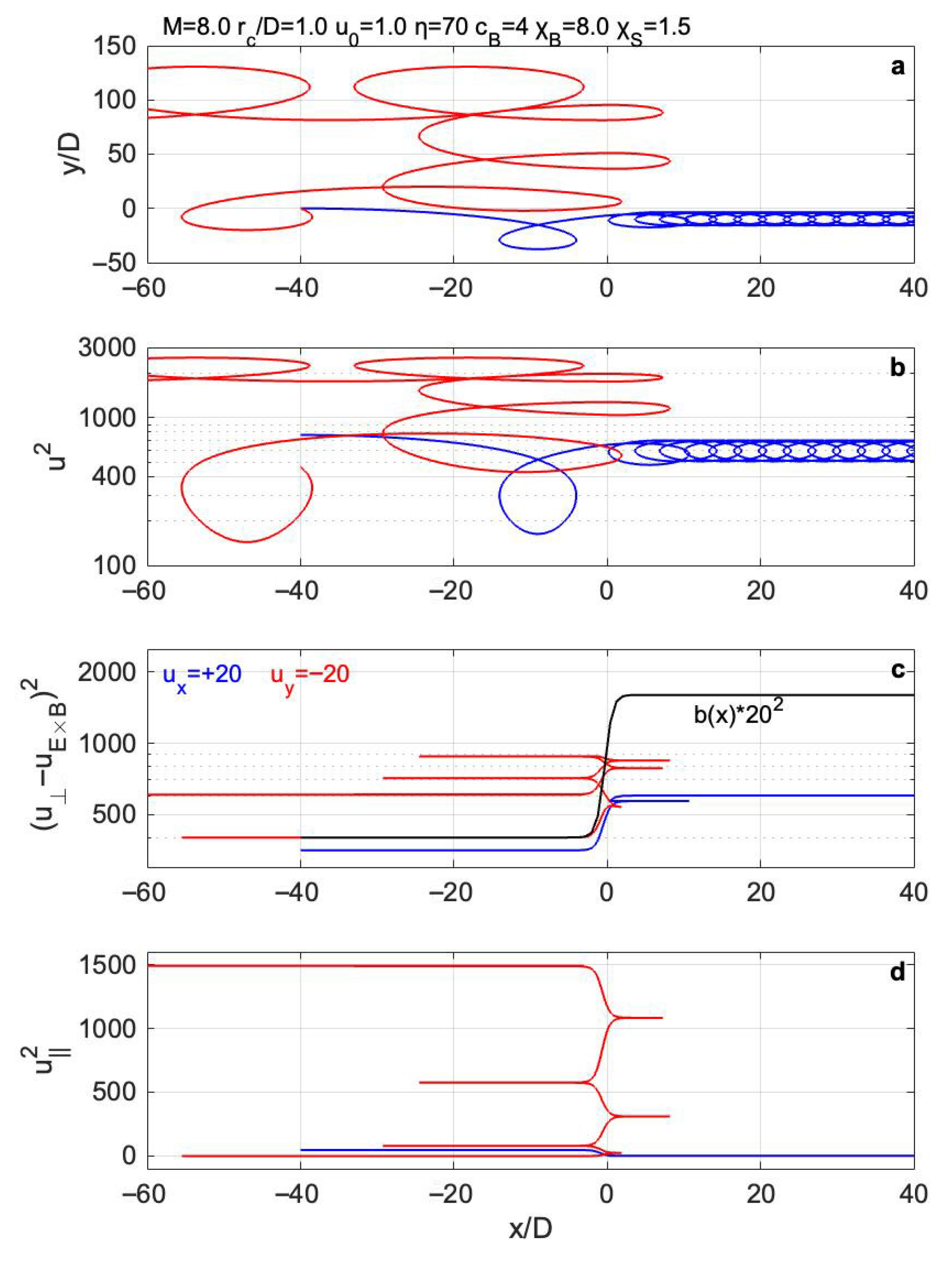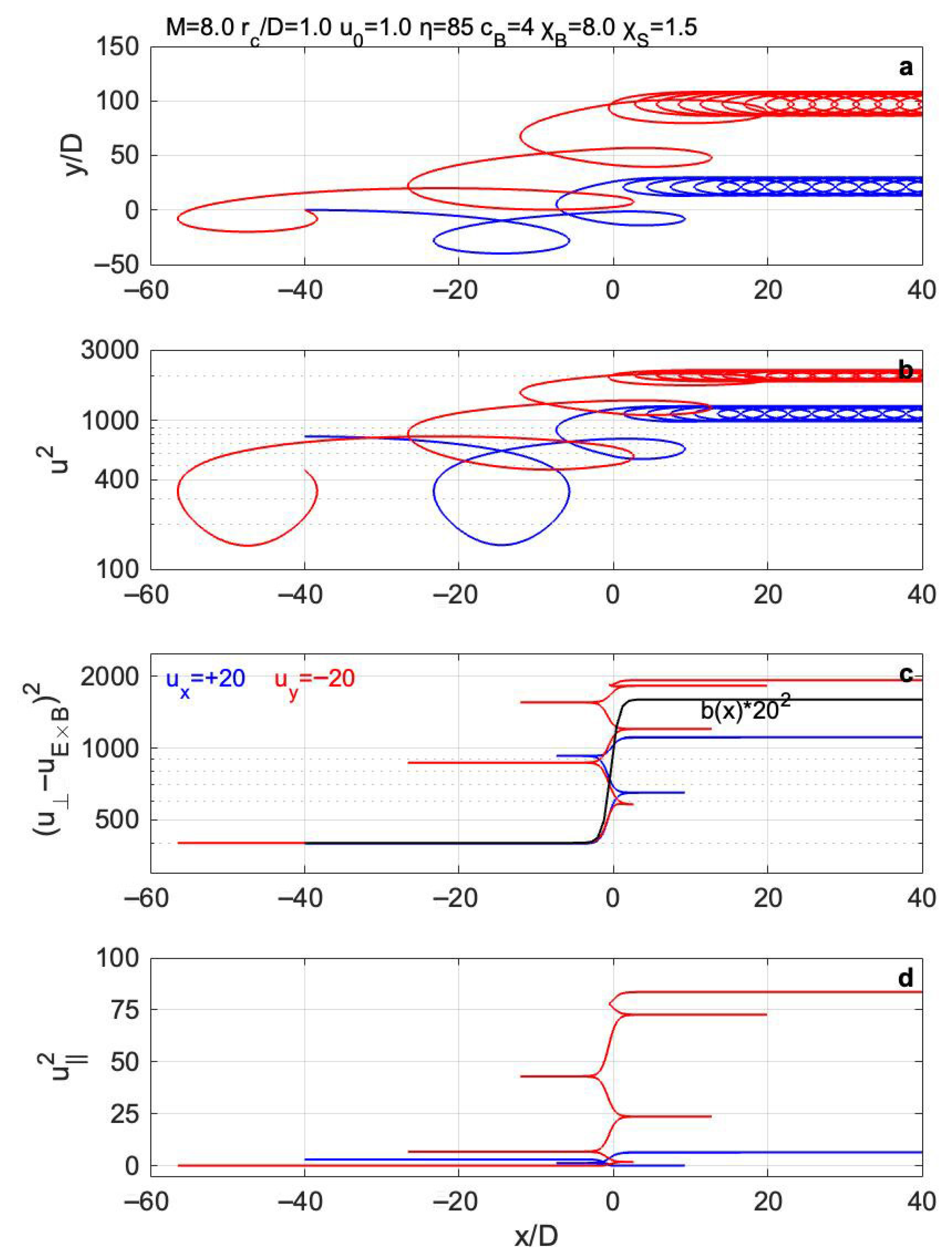 Two ions were injected into an oblique shock, η = 85 , at x = 40 in units of the shock width, and then differential equations were used as described in Ref. [10]. The integration was performed using a standard MATLAB-R2024 routine with automatic step control to ensure a relative accuracy of 10 6 . Figure 1a shows the ion trajectories in plane ( x , y ) . The initial velocity consists of the E × B drift normalized by the upstream thermal speed, u E × B = V E × B / v T i , with additional velocities being u x = + 20 (blue) and u y = 20 (red). Figure 1b shows the total kinetic energies, u 2 , of the ions along their respective trajectories, Figure 1c shows the gyration energies only, ( u u E × B ) 2 , and Figure 1b shows u 2 . An adiabatic projection of the initial perpendicular energy of the red ion is shown as the black curve b ( x ) u 0 2 , where b ( x ) = B ( x ) / B u . Both ions behave non-adiabatically and do not follow the adiabatic projection. One observes that the blue ion makes three crossings of the shock at x = 0 , while the red ion makes seven crossings before being transmitted downstream. Each crossing is associated with an increase in the gyration energy, as seen in Figure 1c.