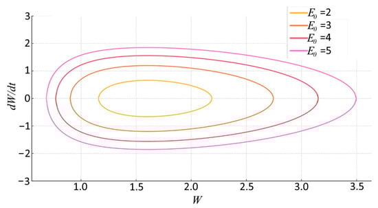 Phase curves for Equation (36) with ,  and  in the case of convex temperature profile for different total energy E0 values as indicated.