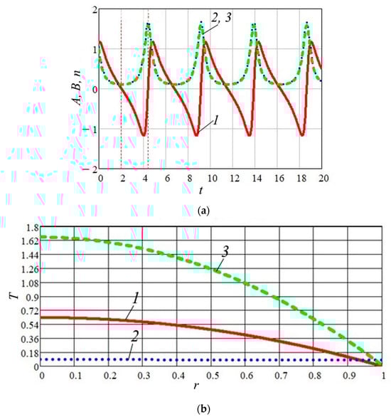 Wave characteristics for . (a) Evolution of  (curve 1),  (curve 2), see Equation (14), and (curve 3). (b) Temperature distribution (15) along the radius at characteristic moments of time:  (curve 1),  (curve 2) and  (curve 3).