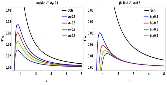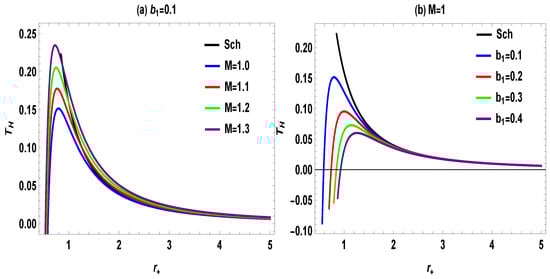 Hawking temperature (12) against horizon radius for (a) fixed value of and varying values of mass , and (b) fixed value of and varying parameter .