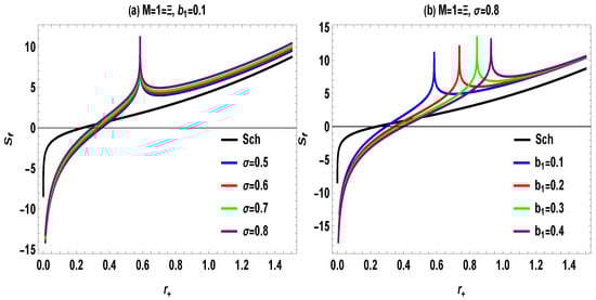 In Figure 3b, as increases, the entropy curve fluctuates to the right and shows a visible peak or divergence when the value of is quite large. The increase in degrees of freedom manifests itself as a sharp increase in entropy above the Schwarzschild entropy after the peak. The entropy value before the peak is smaller than the Schwarzschild entropy value, indicating more complex thermodynamic behavior. As increases, the peak becomes more pronounced and shifts to higher values of . The steep peak indicates that has a significant effect on the phase transition or instability, indicating that this parameter controls the prevailing behavior. The increase in delays the transition to a higher , suggesting that controls the timing of the BH undergoing this thermodynamic change. The overall increase in entropy after the transition implies an improvement in microstructure or a correction to quantum gravity. Lower entropy before the peak indicates that the microstate is suppressed, which may indicate a non-equilibrium state.