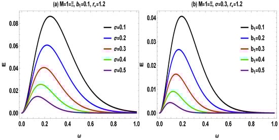 Figure 4 shows energy emission E (47) against photon frequency for varying values of the GUP gravity parameter Figure 4a and parameter (Figure 4b) with fixed radius , mass, and arbitrary parameter . Figure 4a shows for each value of , the energy emission rate E peaks at a certain photon frequency . As increases from to , the peak value of E continues to decrease. As increases, the peak frequency shifts to some degree to lower values of . For lower values of , the overall ejection rate curve becomes flatter, with the tail extending to higher frequencies. The parameter may represent a correction to the gravitational field or an additional parameter related to gravity (possibly related to quantum corrections or alternative theories of gravity). A larger value of reduces the maximum energy emission rate, indicating that the effect of stronger gravitational parameters suppresses the BH’s photon emission. As increases, the peak frequency decreases to lower values, indicating that the BH’s photons are relatively soft as the gravitational influence increases. A higher value of may indicate that the BH is more “stable” in terms of radiation loss, which is a behavior that may reflect how gravitational variations affect the BH Hawking radiation spectrum.