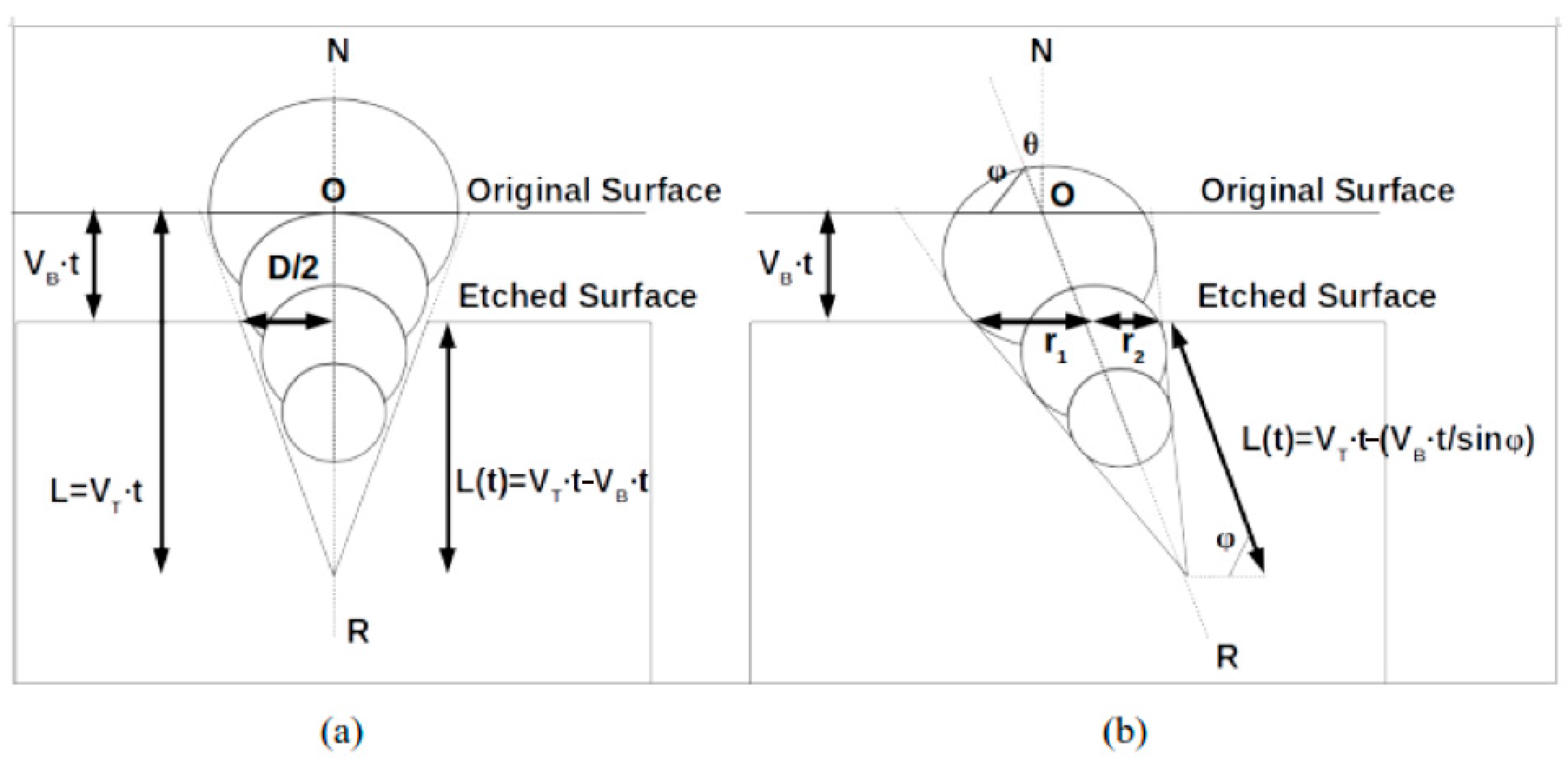 Figure 2. Geometry of a charged particle track for (a) perpendicular incidence and (b) incidence at an angle θ relative to the surface normal N. The main parameters shown include the base cone diameter, the major and minor axes, the height of the etched cone L ( t ) , and the etching rates—bulk ( V B ) and track ( V T ). Taken from Ref. [23] (copyright permission by Elsevier).