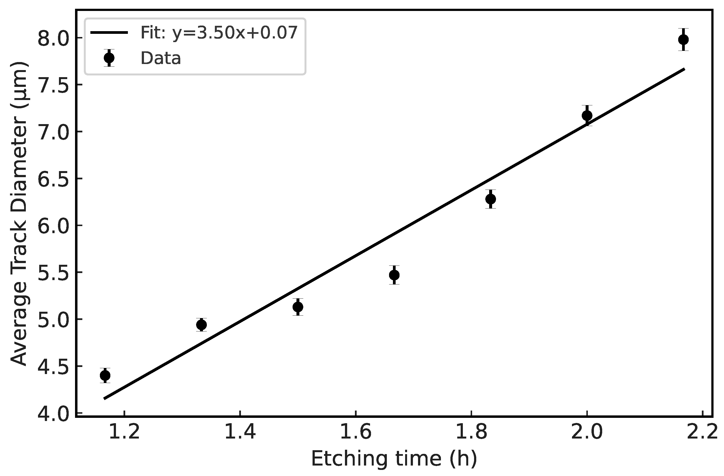 Figure 3 then depicts the distribution of the mean track diameter as a function of etching time. Since tracks are not optically resolvable before a finite visibility threshold time ( t vis 80 min), we analyze the diameter–time relation using the shifted variable t = t t vis . In the finite-p regime for alpha tracks, the base diameter grows linearly with time after visibility onset, so we fit D ( t ) with a zero-intercept model. This approach avoids the artifact of a non-zero intercept at t = 0 , which may otherwise be misinterpreted as a latent track diameter, and ensures consistency with the physical onset of track visibility.