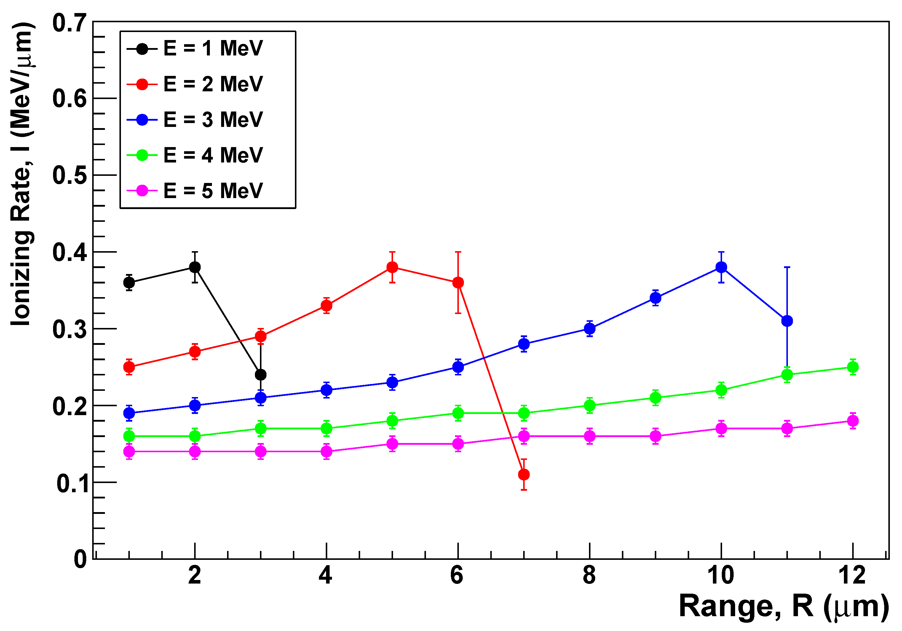 As can be seen in Figure 5, the ionization rate of alpha particles does vary with penetration depth, even within the 12 µm sensitive layer of LR-115. For example, a 5 MeV alpha particle shows an increase from about 0.14 to 0.18 MeV/µm across this depth. However, compared to the sharp Bragg peaks occurring near the end of the particle range, the relative variation within the LR-115 layer is moderate. For practical purposes, and to allow quantitative parameterization of etched track growth, we approximate the track etch rate V T by an effective average value under our etching conditions. This effective V T is consistent with the mean experimental value of ( 7.2 ± 0.1 ) µm/h reported in Ref. [18].