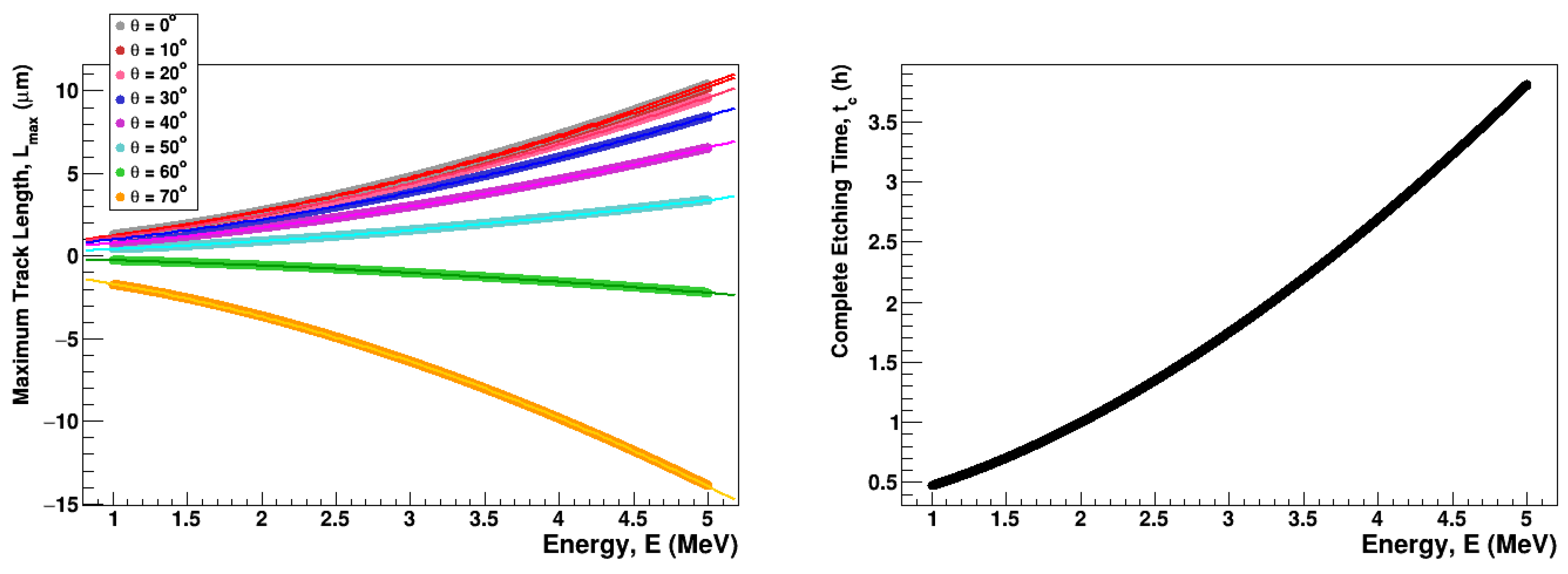 with the fitting parameters as listed in Table 1. Figure 7b presents the complete etching time, t c , as a function of energy. At large incident angles close to the critical angle, the regression curves can yield negative values of L max . These negative values do not represent physical etched tracks but indicate that, under such conditions, the particle trajectory is completely removed by bulk etching before a visible track can form. In other words, those values signal about the loss of detector sensitivity at these angles. Overall, the results show that the LR-115 detector ceases to register tracks at incident angles greater than 60°.