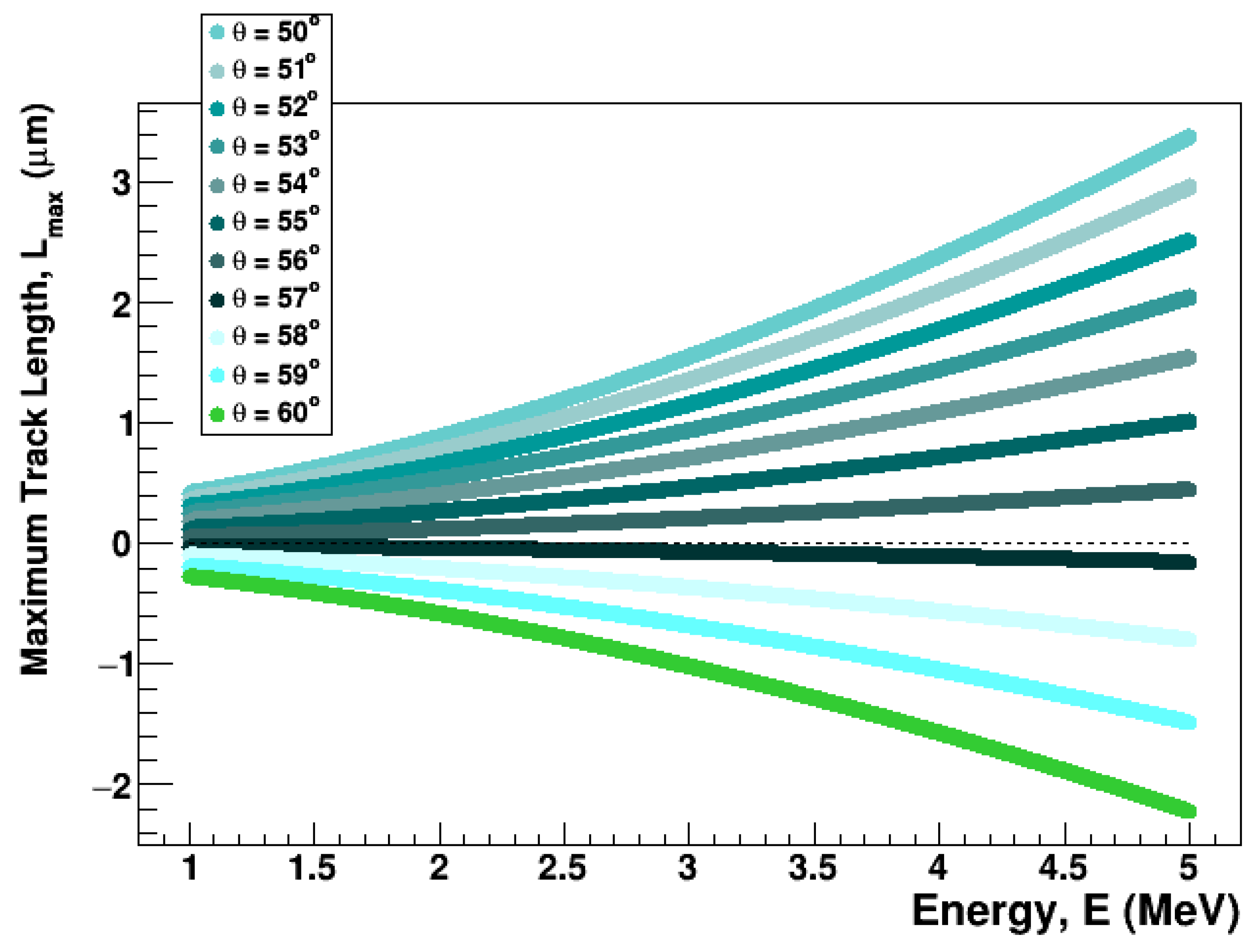 Figure 8. Monte Carlo determination of the critical angle. Maximum track length as a function of alpha-particle energy for incidence between 50° and 60°. A distinct cutoff appears at θ 56.5 ° , in exceptional agreement with the analytical estimate θ c = ( 58.8 ± 1.2 ) ° .