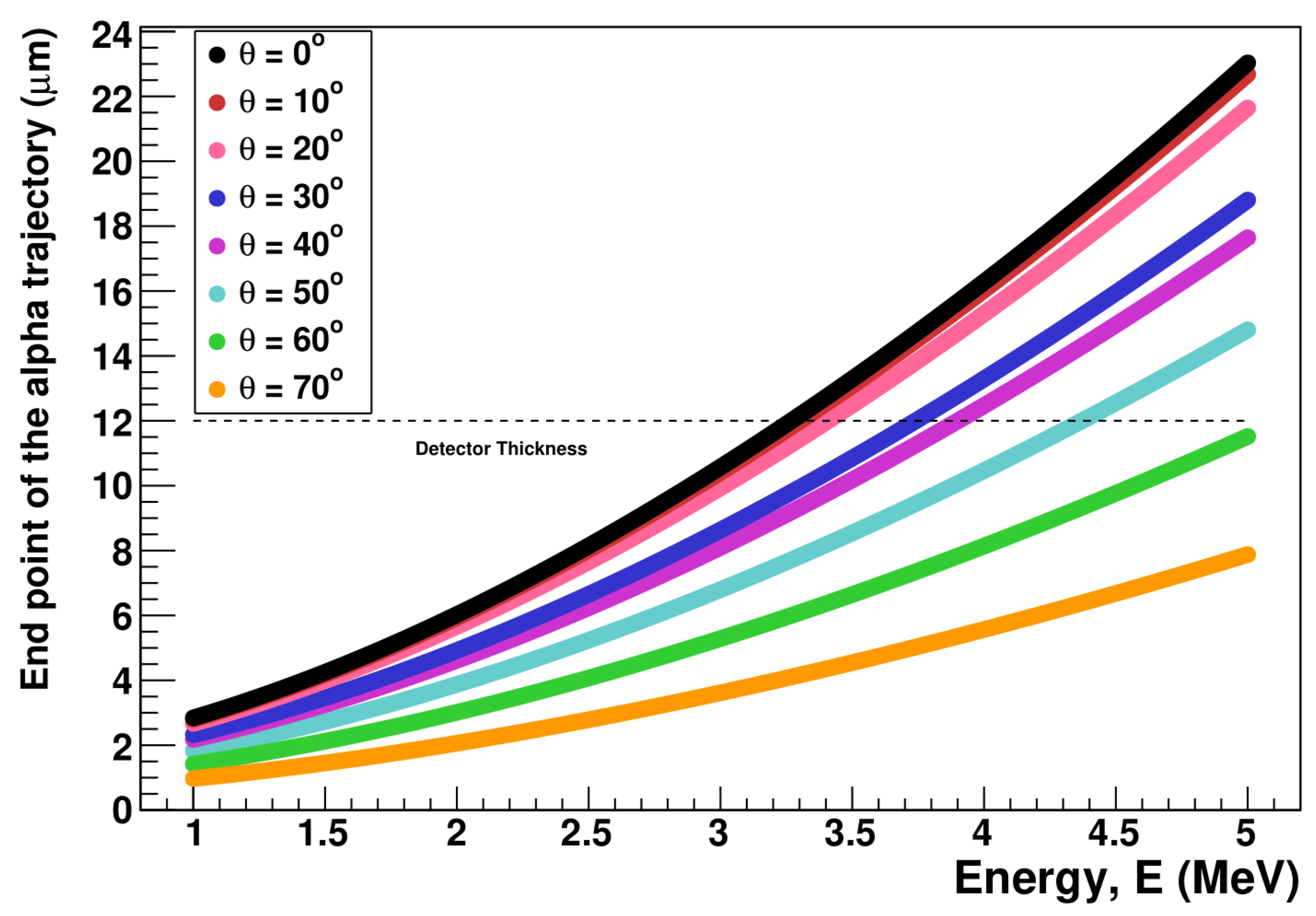 Figure 9. Monte Carlo simulation of the track endpoint depth. End point of the alpha-particle range in LR-115 as a function of the initial energy for different incident angles. The dashed line marks the 12 µm thickness of the sensitive film, above which tracks are no longer fully contained.
