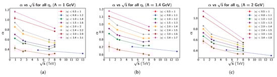 Parameter as a function of the prorton–proton center-of-mass energy for different pseudorapidity intervals. The results (points)) are obtained from fitting the data and are multiplied by certain different factors (as indicated) for a better visualization. The lines are just to guide the eye. The different pseudorapidity intervals are considered and the value of the cutoff is fixed, as indicated. See text for details. (a) GeV; (b) GeV; (c) GeV.