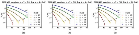 Multiplicity distributions measured in proto–proton collisions at TeV (points) []. The measuremets are fitted by Equation (7) (lines) for different values of the cutoff and various rapidity intervals, as indicated. (a) GeV; (b) GeV; (c) GeV.