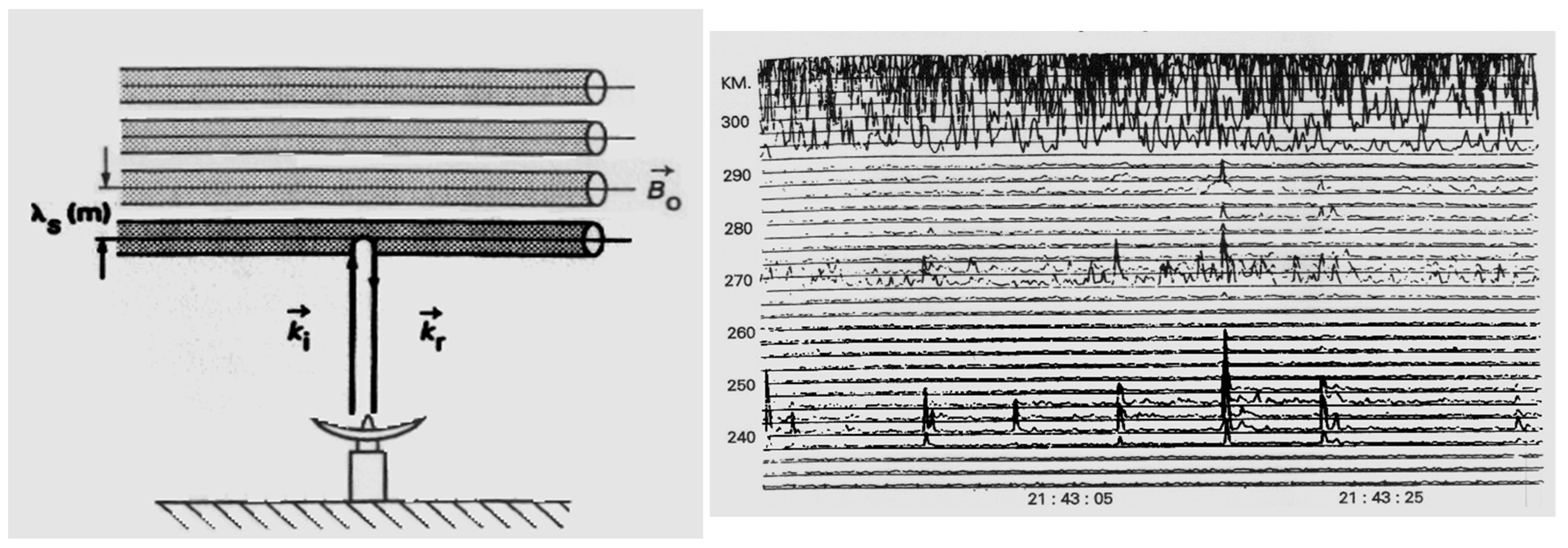 Figure 3. The corresponding radar data given on the right side shows two striking features: (i) a train of short-lived radar pulses separated by approximately 6 s, and (ii) radar echoes occurring at two altitudes, 240 and 270 km. These two features can be explained by the schematic diagram in