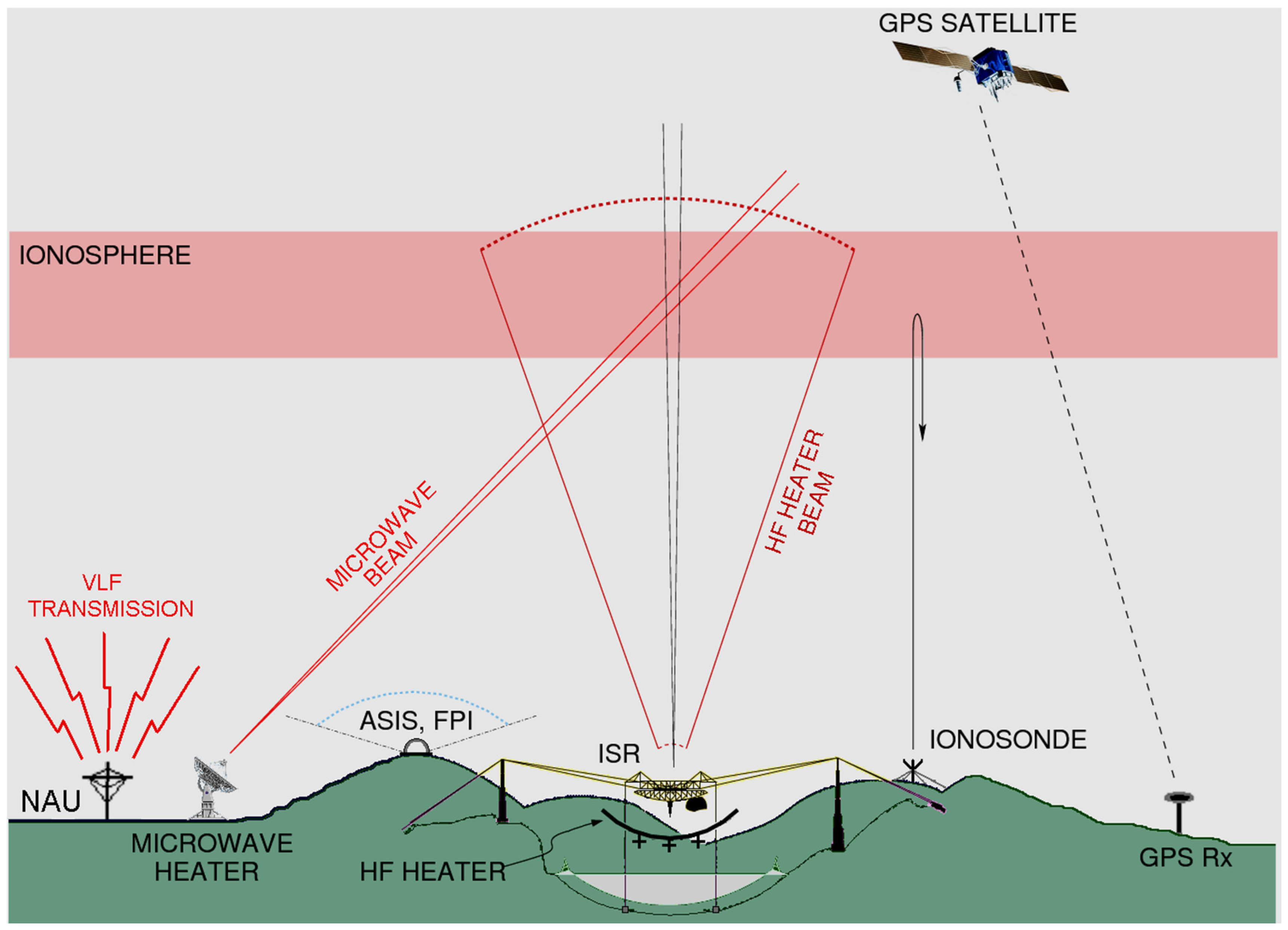 Figure 5, wherein several key radio and optical diagnostic instruments used in the experiments are shown, viz., Arecibo radar, an ionosonde known as CADI, a Fabry-Perot interferometer, and BU-MIT All-Sky Imaging System (ASIS). The NAU transmitted VLF waves propagate primarily within the waveguide formed by the Earth crust and the bottom side of the ionosphere. These waves may enter the ionosphere with a small transmission coefficient. Furthermore, only one circularly polarized component of the linearly polarized VLF waves can propagate in the ionosphere as whistler waves. It is estimated that about 7.5% of the transmitted wave energy can be coupled into the ionosphere, being able to interact effectively with ionospheric plasmas [