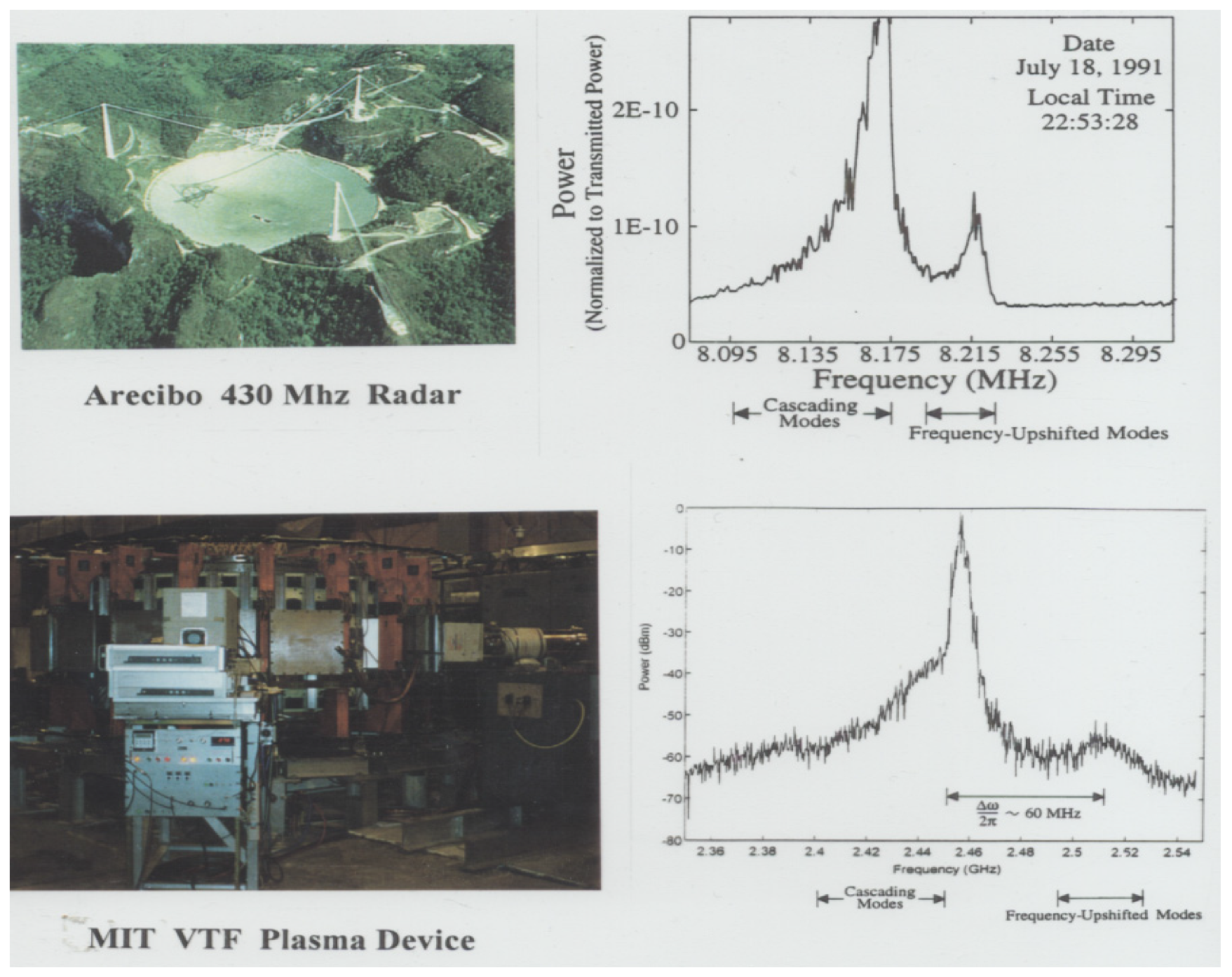 29]. It was expected that these whistler waves propagating along the geomagnetic field interacts with ionospheric plasmas above Arecibo. The 430 MHz radio signal was subsequently transmitted from the Arecibo radar to diagnose the nonlinear effects as predicted by the author and Kuo [