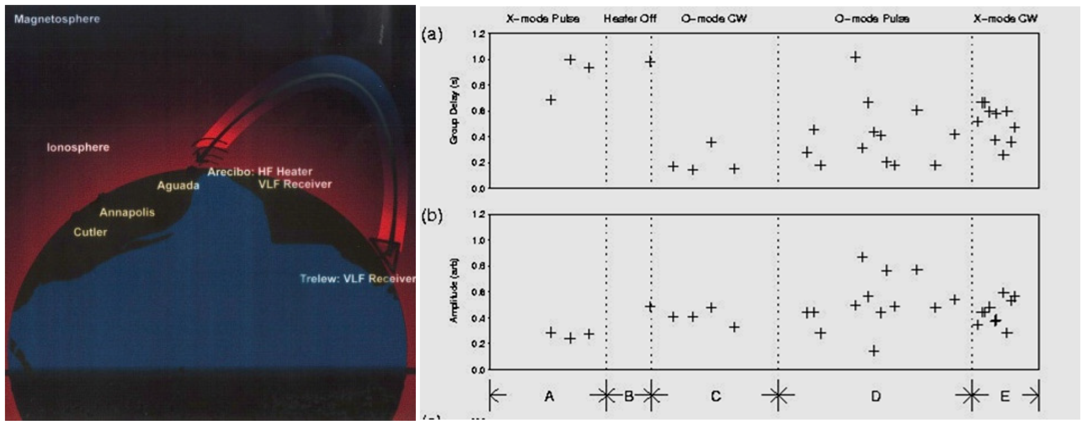 26]. The HF heater was operated in O-mode and X-mode alternately to demonstrate the generation of ionospheric ducts within the meridian plane (in the form of parallel-plate waveguides) for ducted whistler wave propagation. One VLF receiver was deployed at Arecibo Observatory and the other one near the geomagnetic conjugate point at Trelew in Argentina. The successful recording of ducted 28.5 kHz whistler waves in Argentina is seen in the data given on the right side of