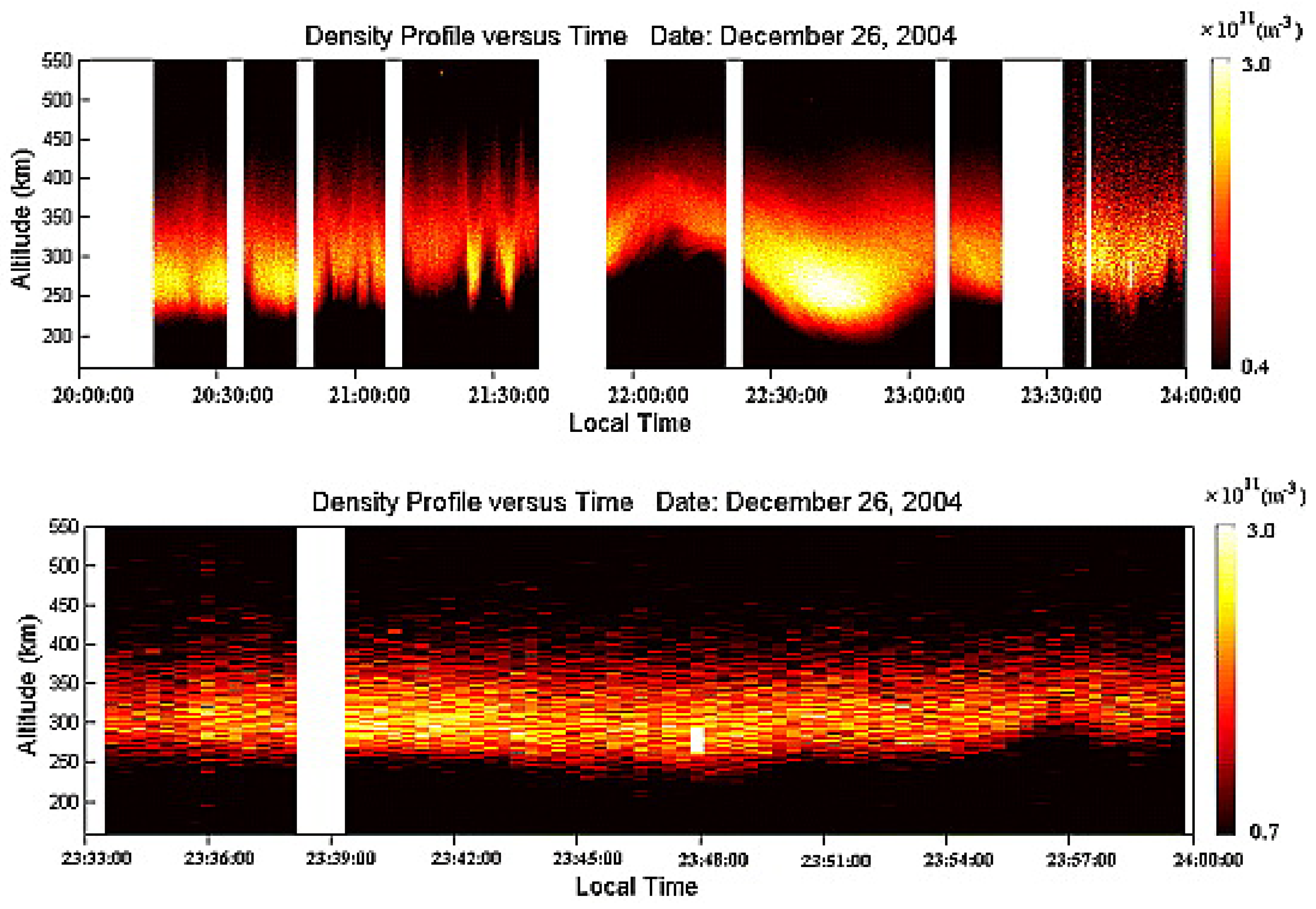 Figure 3. Radar signals transmitted vertically were bounced back by horizontally elongated ionospheric plasma structures, as delineated on the left side of