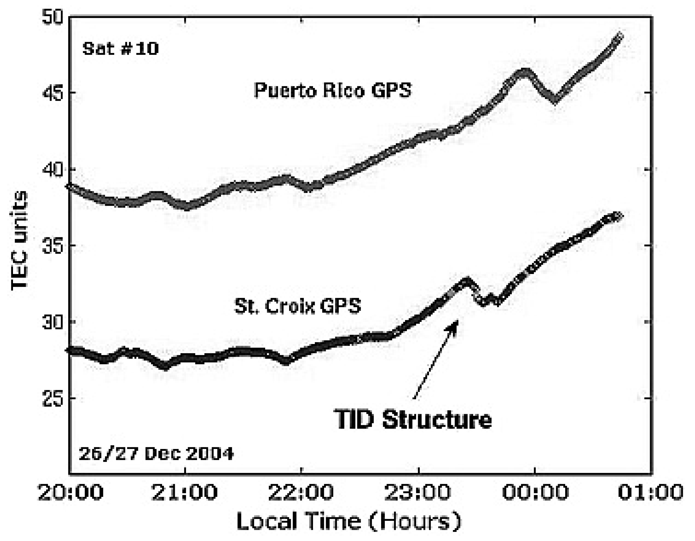 - DasGupta, A.; Das, A.; Hui, D.; Bandyopadhyay, K.K.; Sivaraman, M.R. Ionospheric perturbation observed by the GPS following the December 26th, 2004 Sumatra-Andaman earthquake. Earth Planets Space 2006, 35, 929–959. [Google Scholar] [CrossRef]
