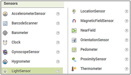 App Inventor is a direct visual programming environment that enables users to create fully functional applications for both Android and iOS devices. This platform is especially beneficial in educational settings, as it allows students and educators to leverage the built-in sensors of mobile devices (Figure 2) to measure various physical parameters such as light intensity, acceleration, and orientation.