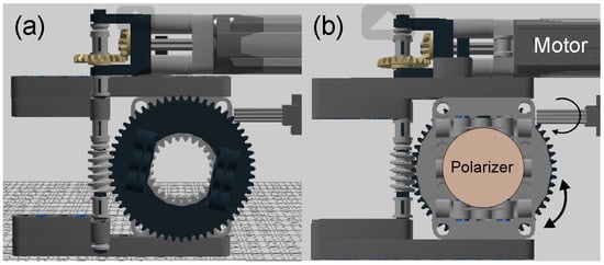 The mount shown in Figure 4 will be utilized in the experimental setup, as outlined in Figure 1. This arrangement allows precise control of the polarizer rotations to accurately measure the resulting light intensities. Figure 5 shows the front and back view of the corresponding experimental implementation, using LEGO EV3 components. In Figure 5, the smart brick is highlighted; it controls the motor responsible to rotate the mount. This control is achieved through the custom application developed in App Inventor.