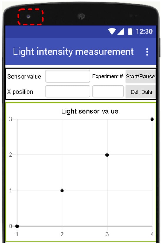 A second polarizer (P2) acting as an analyzer (A) to be placed with its transmission axis aligned along the y-axis (represented by a dashed line). This setup allows only the intensity of the component to be measured using a mobile phone, via a user interface designed in App Inventor. Figure 7 shows the user interface design used to measure and save the light intensity data received by the mobile, which is displayed numerically and graphically. In the graph, the x-axis shows the number corresponding to the current measurement; while the y-axis shows the detected light intensity (the area enclosed in a rectangle with dotted lines shows the location where the light sensor is actually located).