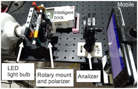 - Freitas, W.P.S.; Cena, C.R.; Alves, D.C.B.; Goncalves, A.M.B. Arduino-based experiment demonstrating Malus’s law. Phys. Educ. 2018, 53, 035034. [Google Scholar] [CrossRef]