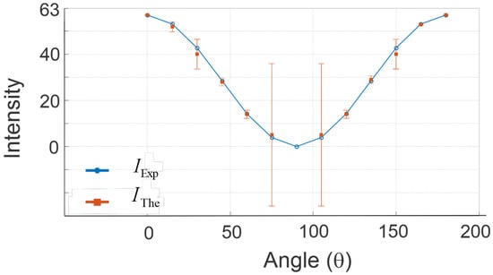 To verify Malus’s law, we conducted an experiment where the light intensity was measured at different angles of the rotating polarizer P1, while the transmission axis of P2 is perpendicular to it. The light sensor of a mobile device aligned to the output beam was used to capture the intensity values. The theoretical and experimental intensity values regarding Malus’s law were calculated using Equation (2).