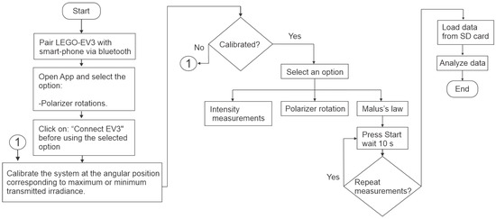 Flow diagram summarizing the experimental procedure for demonstrating Malus’s law using the LEGO EV3 system and the custom mobile application.