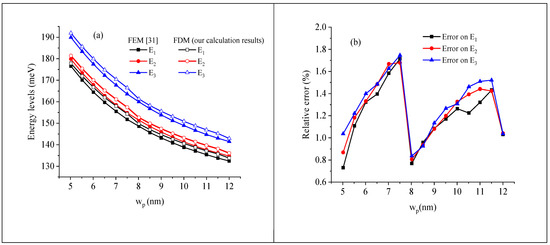 Analyzing the first of those methods, corresponding to Figure 2a, one can notice that the electron energy levels decrease with increasing the QR width from wp = 5 to 12 nm. This is due to the reduction in the confinement phenomenon of carriers. Also, as shown in Figure 2b, our results are in agreement with those obtained with the FEM within a relative error below 2%.