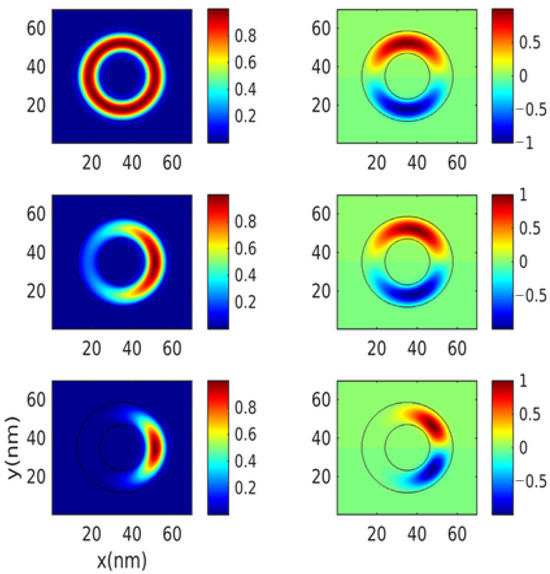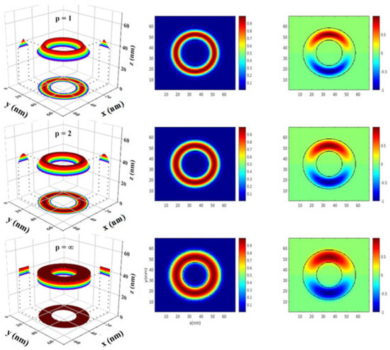 Figure 3 (left) illustrates the elliptical QR structure with triangular (p = 1), parabolic (p = 2), and square transversal profiles (p = ∝) in Figure 3, top to bottom, respectively. Figure 3 (middle) and Figure 3 (right) display a cross-section of the wave function distributions of the ground and first excited states on the half of the maximum height at z = z0 + (A + H)/2, where z0 = Lx/2 = Ly/2 = Lz/2 = 35 nm.