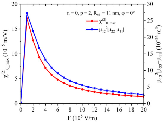 It is observed that is also proportional to the as the electric field intensity increases from zero to F = 20 × 105 V/m. Accordingly, the NOR magnitude starts with an increase and reaches its maximum value = 17.116 × 105 m/V for F = 1 × 105 V/m, then it drops rapidly with increasing electric field intensity. Therefore, the optimum overlapping between the ground and first excited states is achieved at this quenching electric field, F = 1 × 105 V/m. Subsequently, the external electric field applied along the x-axis of such a structure breaks the symmetry of the QR structure and provides a modification to the confinement potential, which generates a change in the wave function distributions, and consequently, a change in the geometrical factor is achieved.