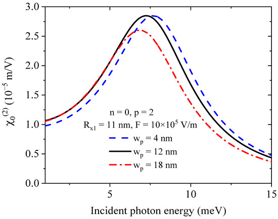 To have more insight into the QR effects’ transversal profile, in Figure 4 we show the NOR coefficient as a function of the incident photon energy. It can be readily noticed that the NOR intensity increases following an increase in the transversal profile parameter p. This behavior is explained by an increase in the geometrical factor, , with the increase in the transversal profile parameter. Thus, the transversal profile parameter can be used as a tuning factor to fine-tune the nonlinear optical properties.