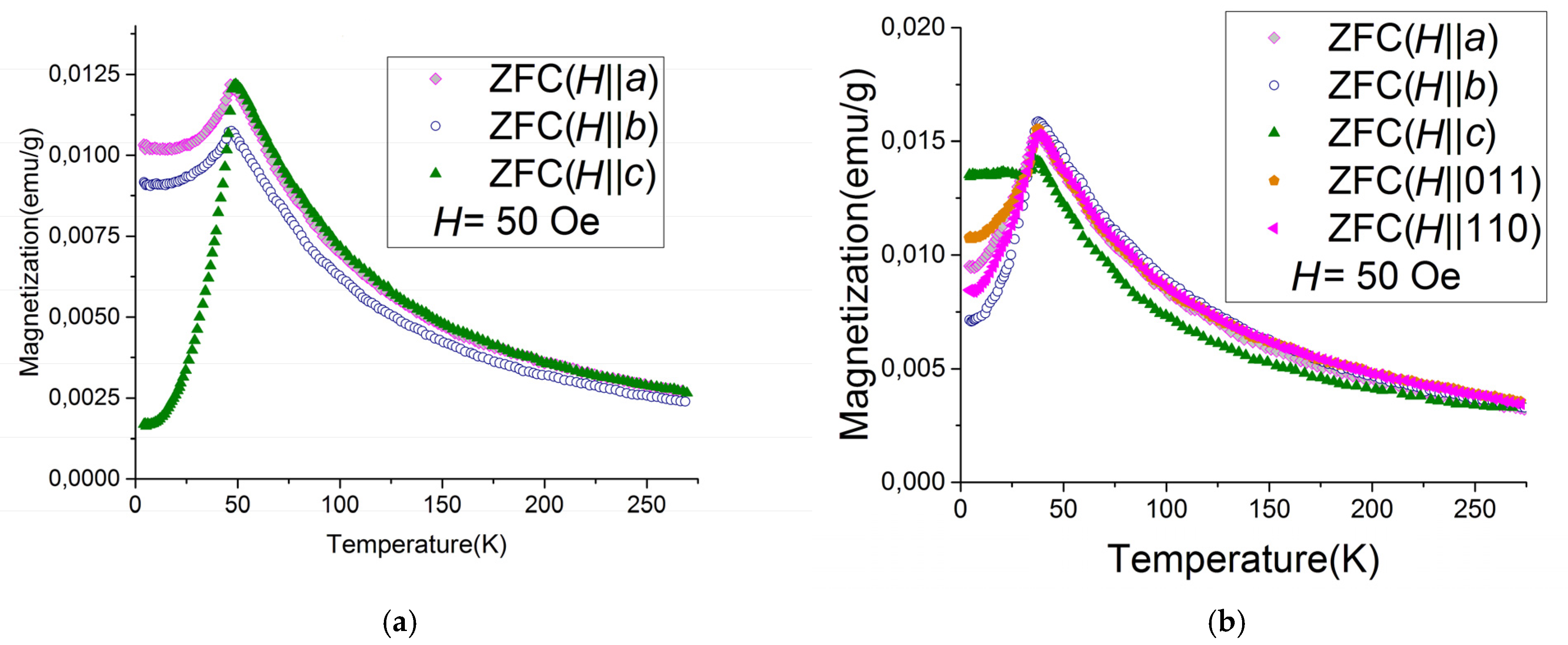 - Bezmaternykh, L.N.; Sofronova, S.N.; Volkov, N.V.; Eremin, E.V.; Bayukov, O.A.; Nazarenko, I.I.; Velikanov, D.A. Magnetic properties of Ni3B2O6 and Co3B2O6 single crystals. Phys. Status Sol. (b)/Basic Sol. State Phys. 2012, 249, 1628–1633. [Google Scholar] [CrossRef]