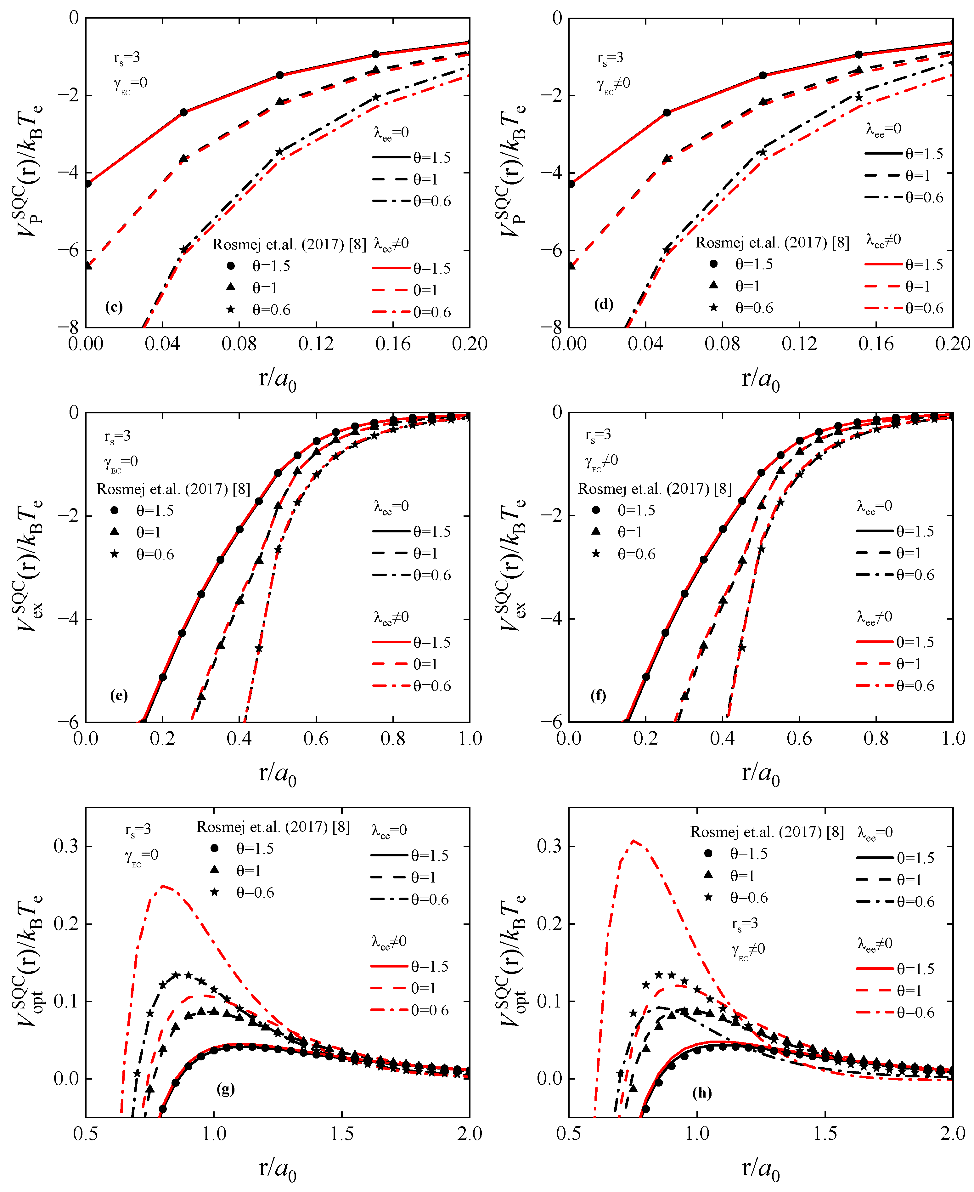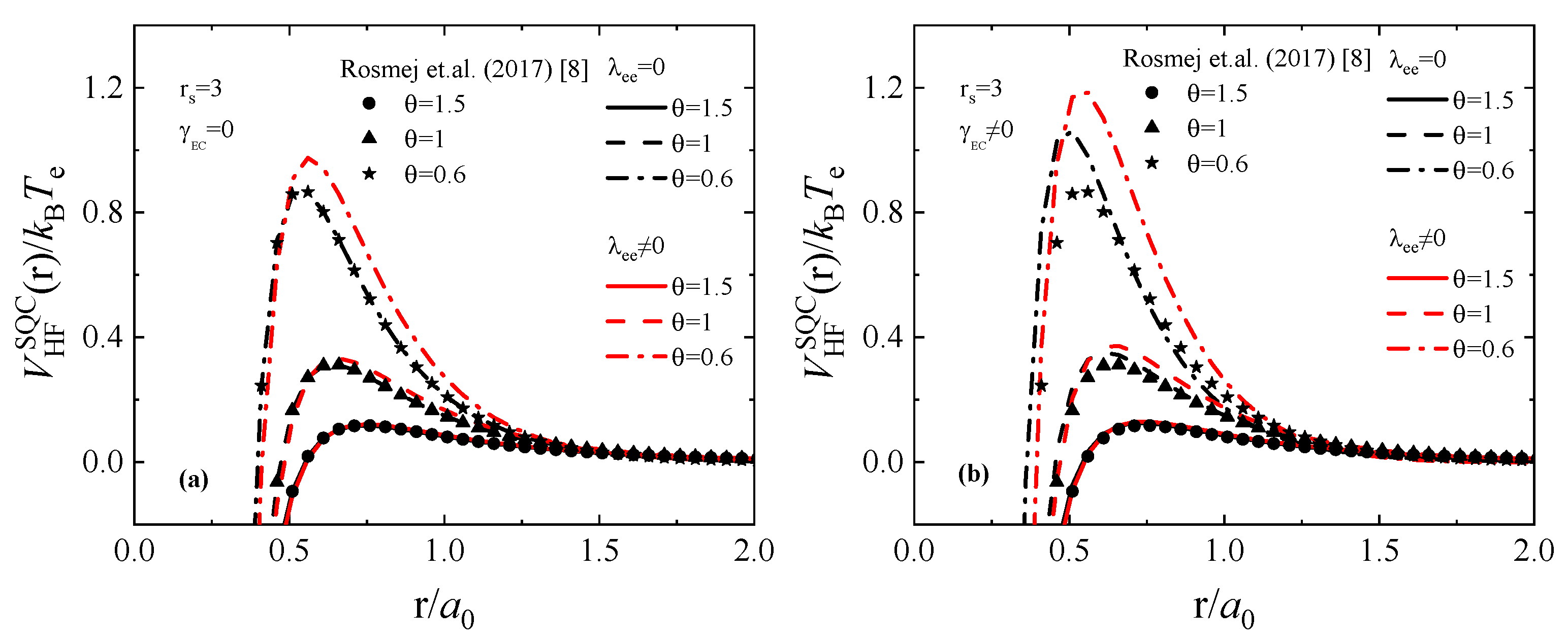 Figure 1e,f shows the s calculations of the effective exchange potential (12). In this case, the effects of the quantum non-locality of the field and electronic correlations have only quite a weak influence on the potential, although in general, an increase in the electron temperature (i.e., an increase in