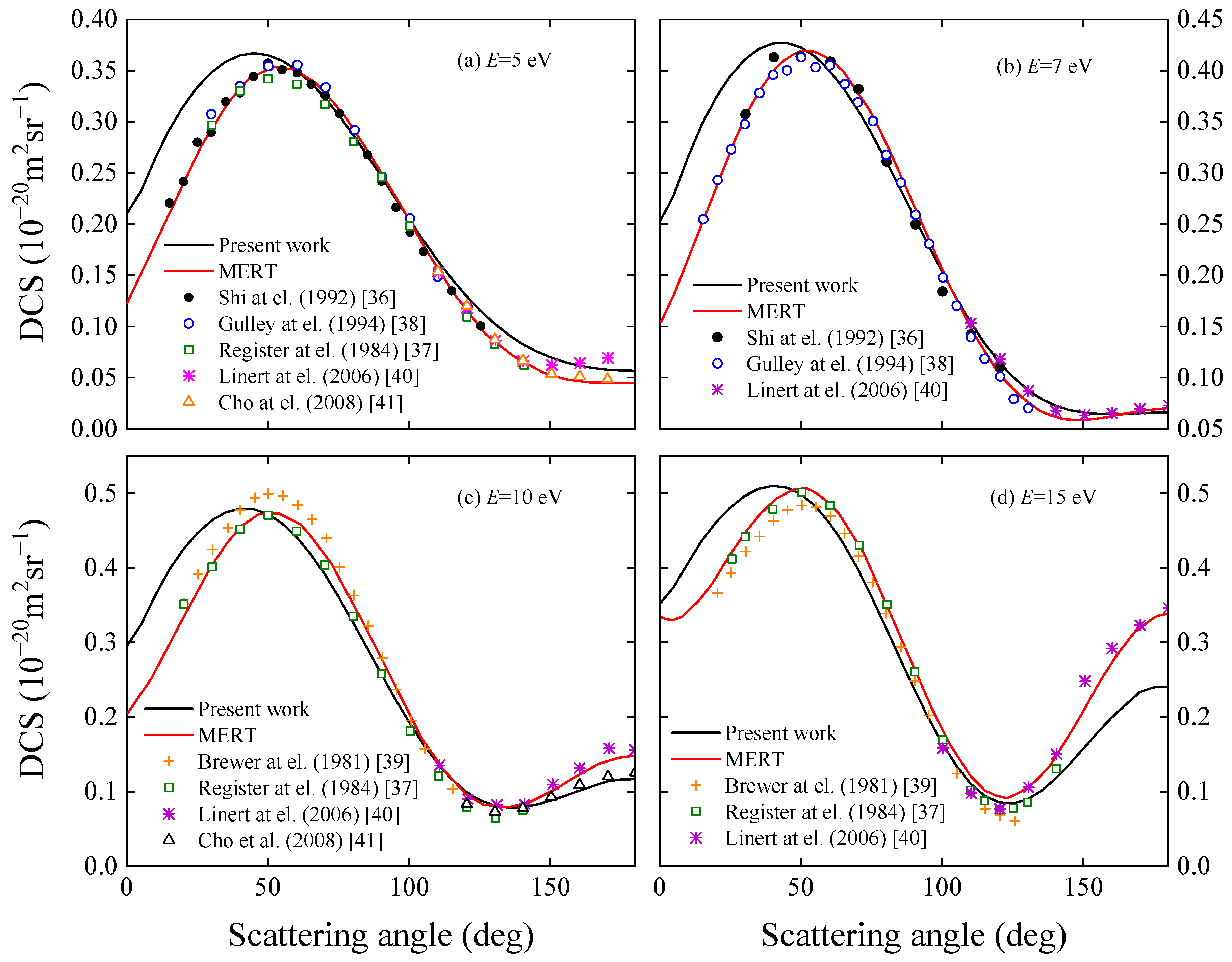 Figure 4 shows the angular distributions of the DCSs for electron scattering on the neon atom. For comparison with the experimental data, we used the data obtained for electron scattering on isolated atoms (