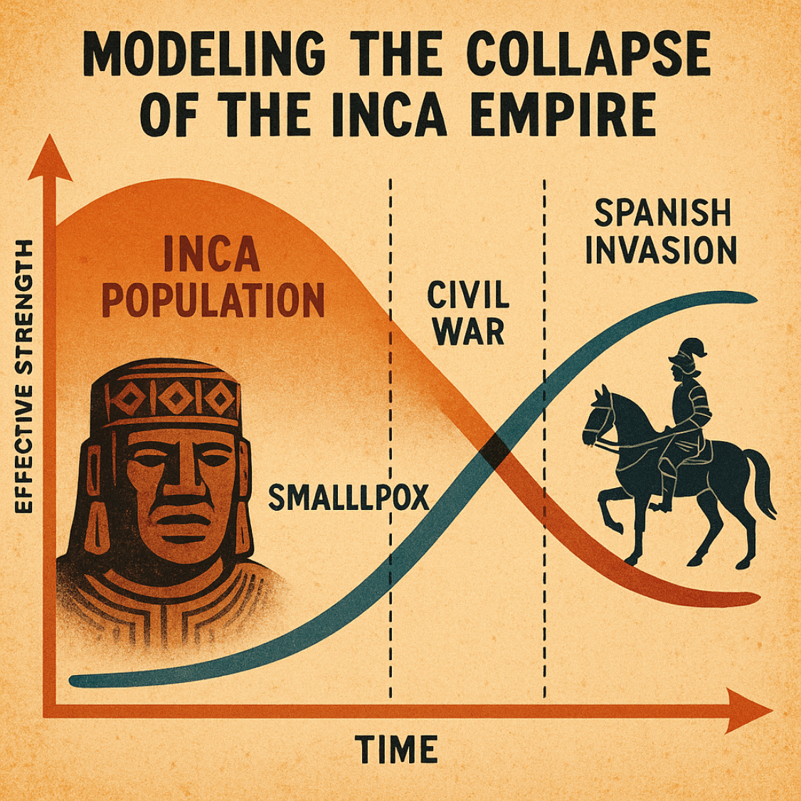 The first phase simulates the evolution of the empire before the Spanish arrival, incorporating endogenous stressors such as political fragmentation and epidemic mortality. The second phase models the dynamics following the Spanish incursion in 1532, capturing the asymmetric interaction between a declining indigenous population and a comparably small but strategically effective invading force. Such an approach builds upon earlier mathematical studies of state formation, collapse, and socio-ecological dynamics [