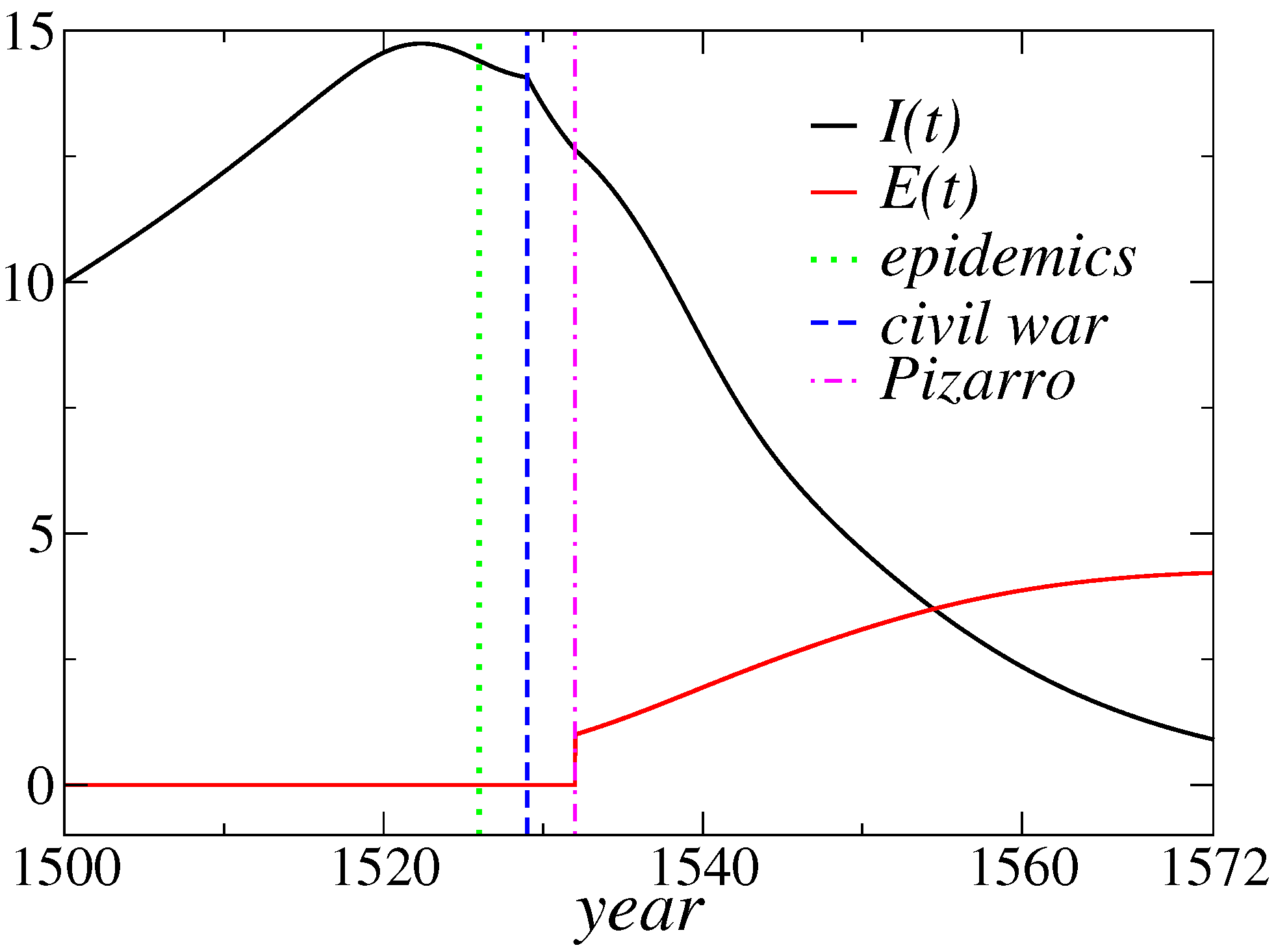 , from 1500 to 1572, obtained from the numerical integration of the two-phase model’s Equations (
